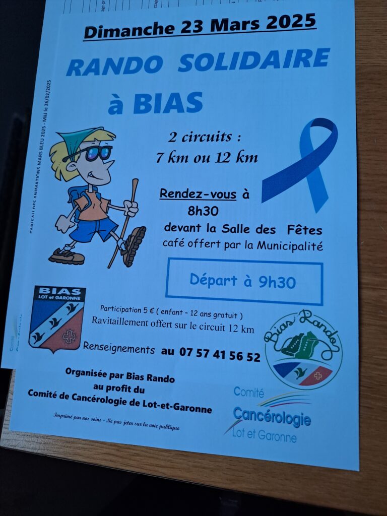 Rendez-vous DIMANCHE  23 MARS 2025 à BIAS (Lot & Garonne) pour une Rando solidaire de 7 ou 12 Km