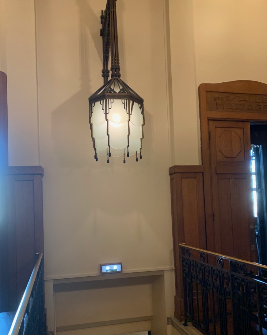 La fresque de la Basilique – le tombeau de Saint Quentin à la Basilique –  la lampe Art Déco de l’escalier du 1er étage de l’Hôtel de ville – la salle du Conseil – la salle des Mariages avec la cheminée.